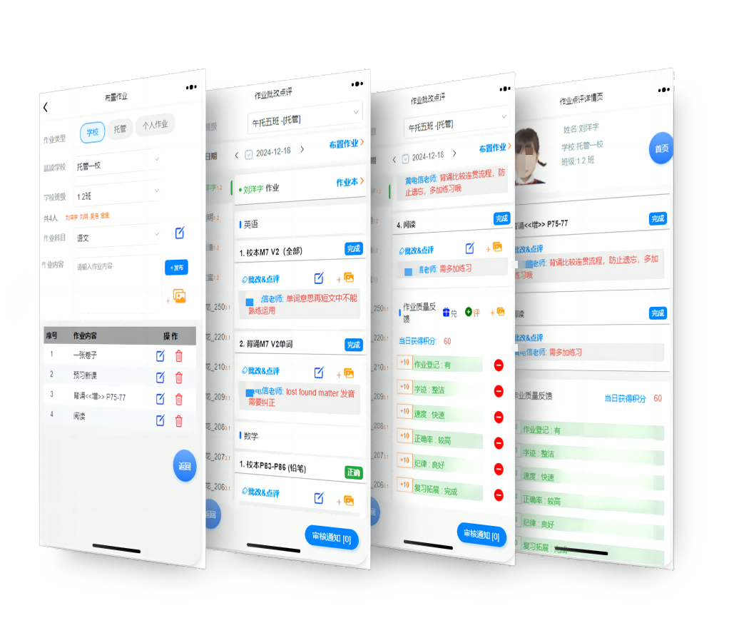 布置作业:文本/复制/拍照/图片录入/图片裁剪题目 布置方式:班级批量录入,单个学员录入 作业批改:未完成/已完成/正确/错误/上传批改图片/老师评语